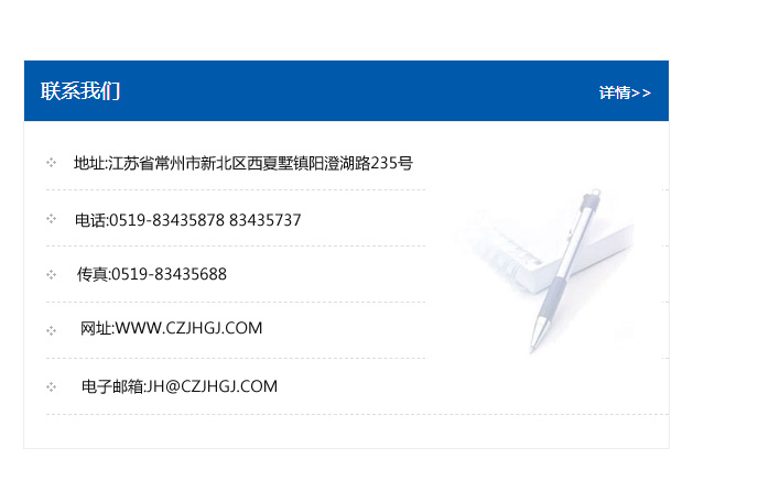 地址:常州市新北區友邦商務大廈1幢16、17層  電話:0519-85101652  傳真:0519-85112595  郵編:213022  網址:www.cz-jiayue_cn.shdhcy.com  郵箱:xiajifengaa@163.com